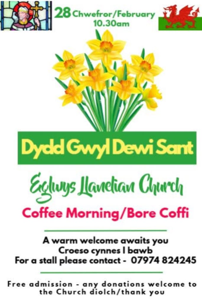« All Events This event has passed. Dewi Sant Coffee Morning 28 February @ 10:30 - 12:30 « Quiz night every Thursday Man Space » Add to calendar Google Calendar iCalendar Outlook 365 Outlook Live Details Date: 28 February Time: 10:30 - 12:30 Event Category: St Elian Church Venue St Elian Church St Elian Llanelian, Conwy LL29 8YA United Kingdom + Google Map View Venue Website to add your event email info@llanelian.co.uk